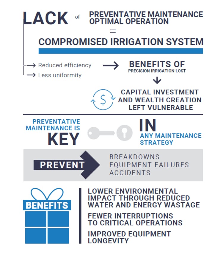 The benefits of preventative maintenance are endless as seen below, reducing the overall cost of ownership. Practicing preventative maintenance activities, such as regular dripline flushing, is vastly more cost-effective compared to reactive maintenance. This allows the team to focus on improved crop production and achieving higher yields, instead of continuously fighting fires.