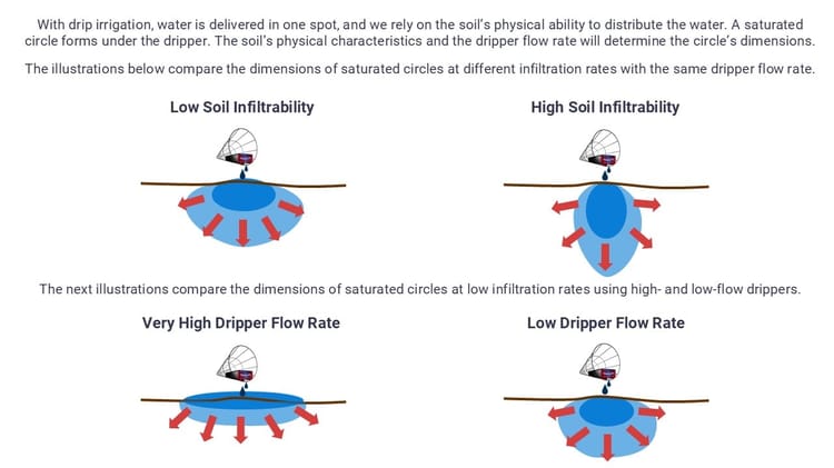 “Based on what we saw in the orchards, we started thinking in terms of three types of movements of water in soil: gravitational, capillary and what we called overflow. Overflow occurs when water delivery exceeds soil infiltration, causing surface wetness instead of deep saturation. “Often when large, wetted areas are visible when working with clay soils, it does not mean that you have a nice and broad wetted bulb, but rather that overflow occurred.”