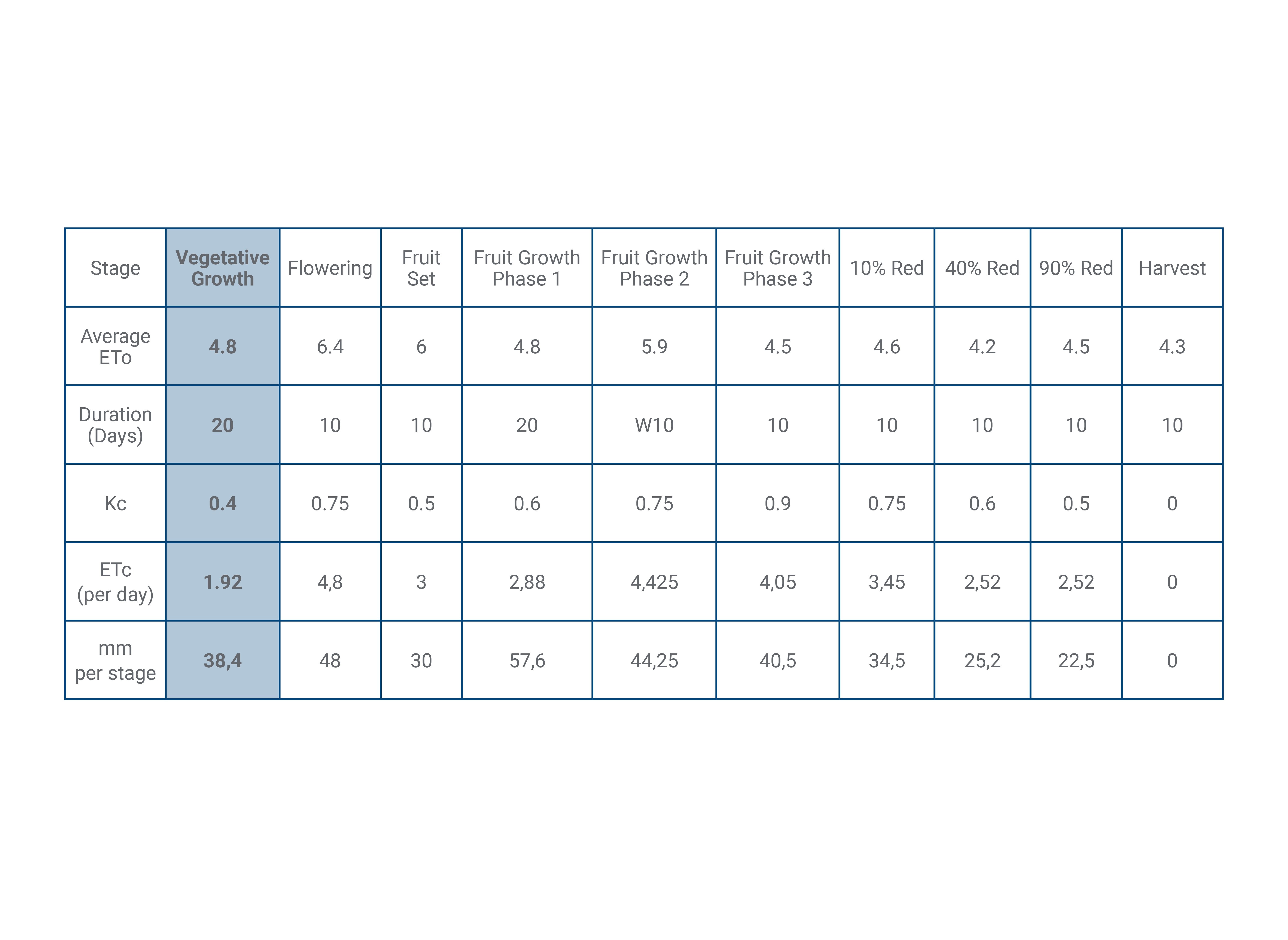 Take note that the crop coefficient (Kc) will differ for the same crop between different phenological stages, which will of course, impact the water demand. The table below is based on data collected over five years from a tomato field in Komatipoort. It explains differences in water demand during different phenological stages.