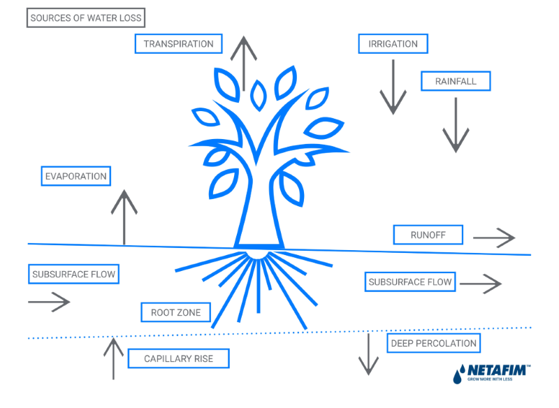 Efficient water use is about preventing water loss on the one hand and ensuring optimal water intake by the roots on the other hand. Water loss can occur through evaporation, deep percolation, subsurface outflow, run-off, and transpiration. The latter is the only positive water loss as water moves through the plant.