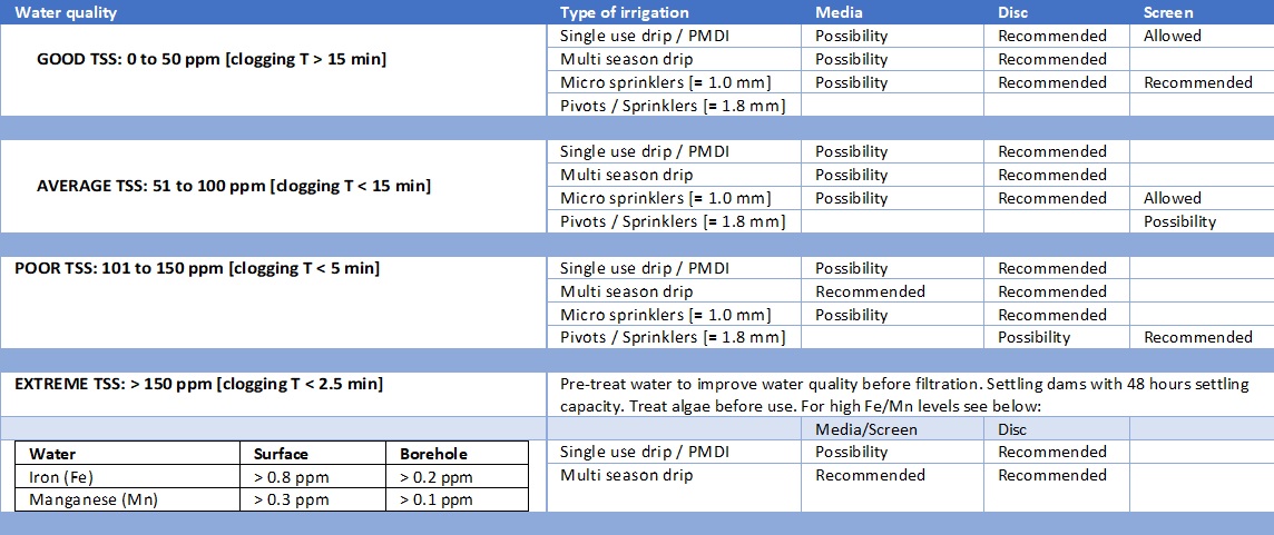 Although it is very simplified and each choice will be determined by the unique circumstances of an irrigation project, the table below gives an indication of filtration type selection based on physical water quality and the type of irrigation used.