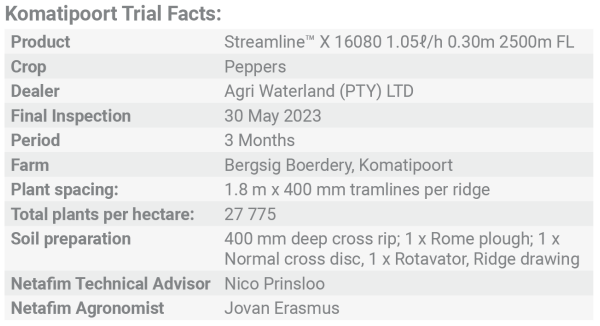 Netafim South Africa is often involved in on-farm product trials, whether it is to test agronomic principles or product developments. One such trial, was a recent trial of Streamline™ X thin wall driplines on peppers at Bergsig Boerdery in Komatipoort.