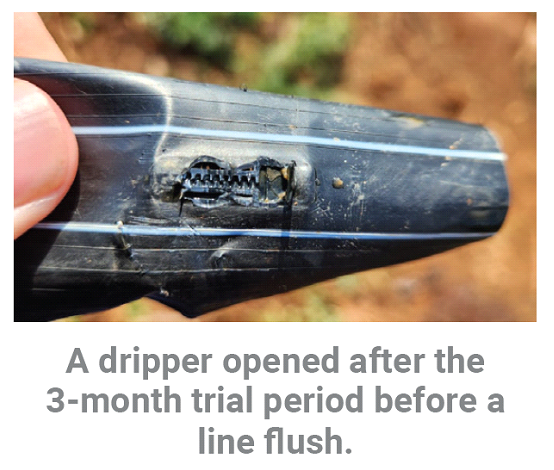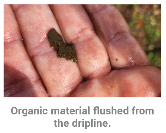 “In cases such as this, it is especially important to flush driplines correctly with a significant pulse motion to make sure all the organic material clogged inside the dripline is flushed out. It is also important to make sure that there is enough pressure to flush the driplines properly,”