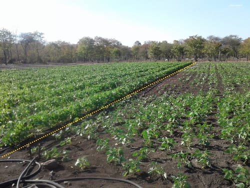 The difference drip irrigation can make. This photo was taken on a small-scale farm, the plants on the left are under drip irrigation and the plants on the right are irrigated with impact sprinklers. This farmer is growing more with less.